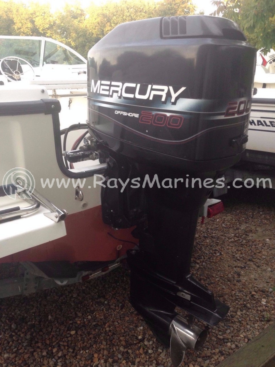Less than 200 Hours on this Mercury 200HP. Very clean engine, senior citizen owner, never used hard.Includes gauges, harness, oil tank, and side mount throttle. Stainless Prop.Still attached to 20' Boston Whaler.